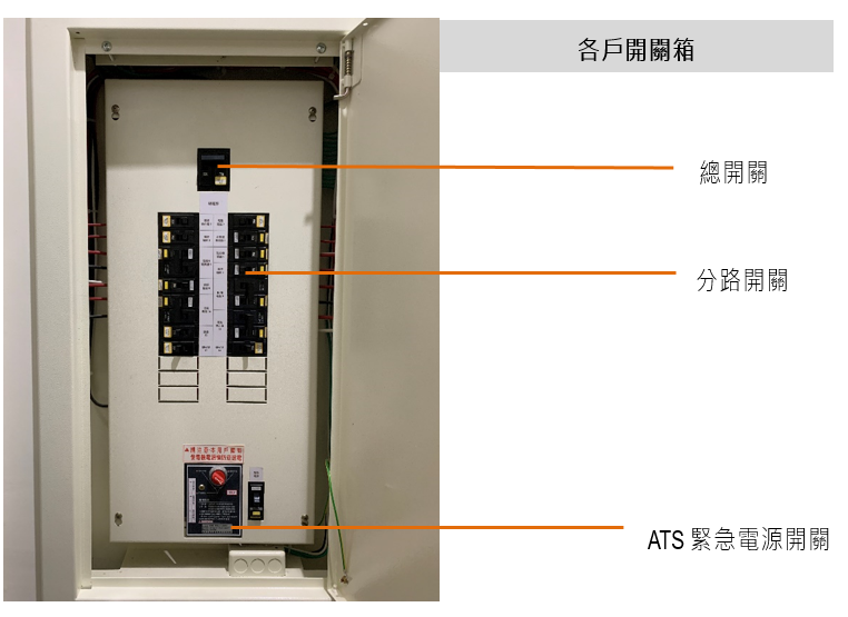 - 開關箱內各迴路的容量依保護開關標示數值,各迴路用途另貼記在開關箱上。