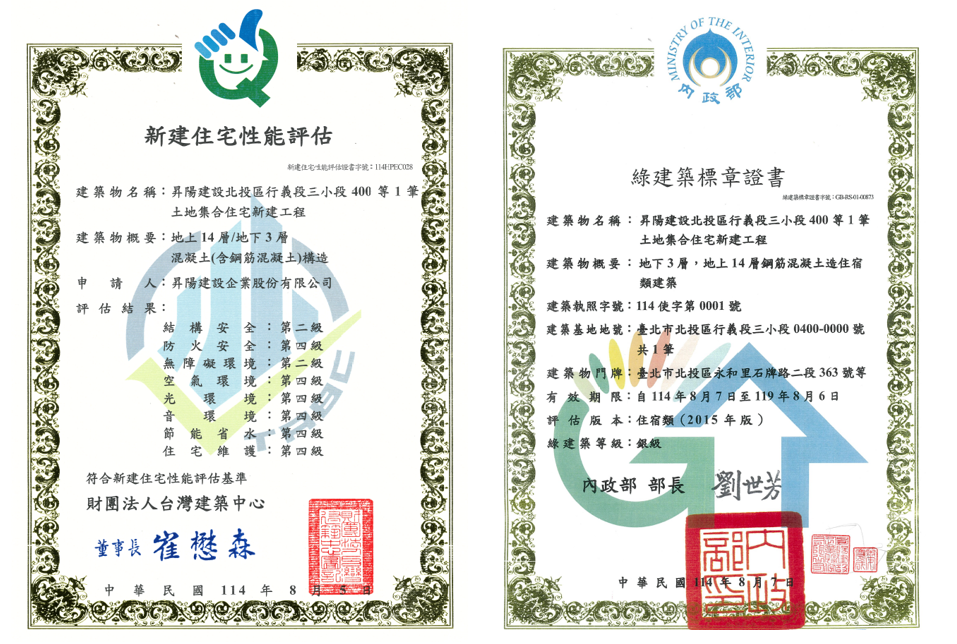 昇陽建設所建個案依循內政部「綠建材標章」政策,選用具綠建材相關認證之裝修建材,提供更優質的建築品質讓居住空間更舒適、健康。另透過選用具 綠建材認證之建材以遏止劣質建材魚目混珠,以確保所建個案更能符合健康環保的要求。