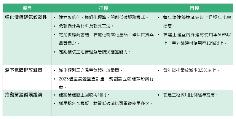 強化價值鏈氣候韌性、溫室氣體排放減量、廢棄物循環再利用。以上三大目標設有對應之量化指標,專責單位每季向董事會提出管理階層風險評估、與氣候風險有關的內部政策評估、檢視執行狀況,並依大環境趨勢滾動調整,落實目標追蹤與風險管理,以減緩氣候變遷衝擊,維持企業穩定營運。