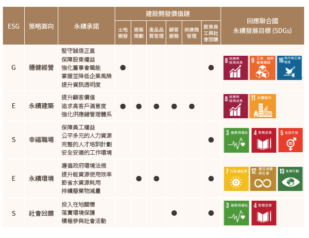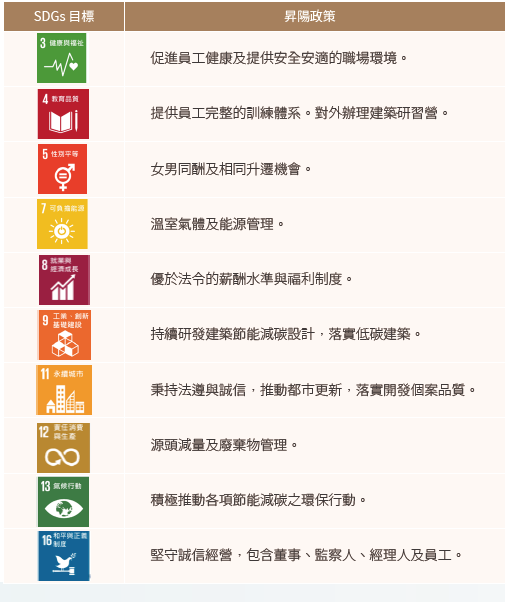 為確保昇陽建設永續發展略符合國際永續治理框架,我們以建設開發價值鏈的永續承諾回應聯合國所擬定的永續發展目標(SDGs),期許與國際趨勢同步,落實企業永續發展之承諾。